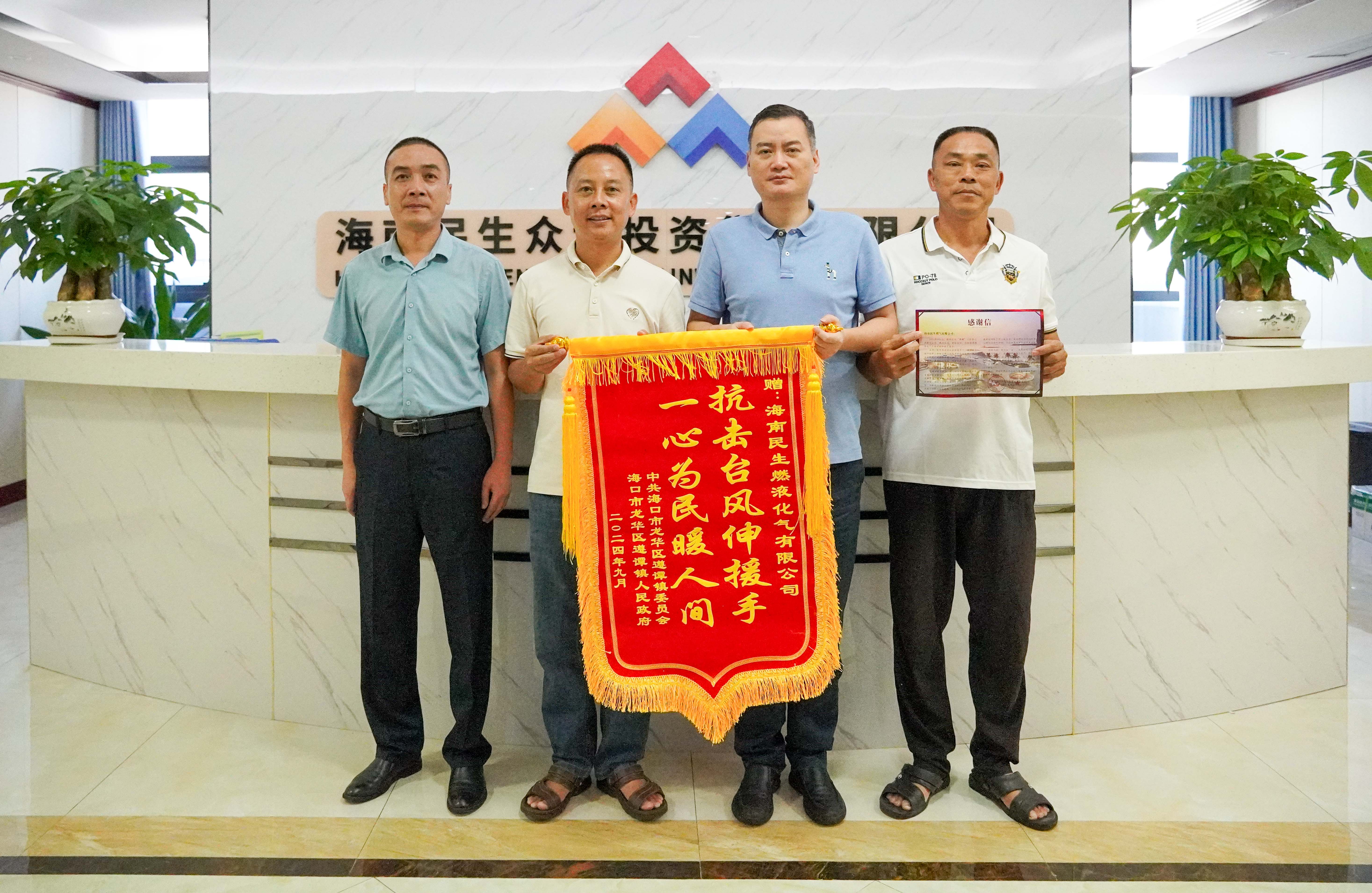 “災后搶修和保供很不容易,我們真的很感謝在這種情況下,貴公司還能抽調人力物力給予我們支持”。9月29日,海口市遵譚鎮黨委委員、武裝部長陳興華與遵譚鎮主任科員吳多興來到海南民生燃氣與海南民生液化氣,代表遵譚鎮送來了錦旗與感謝信,對公司在臺風“摩羯”過后對遵譚鎮所給予的幫助表示感謝。